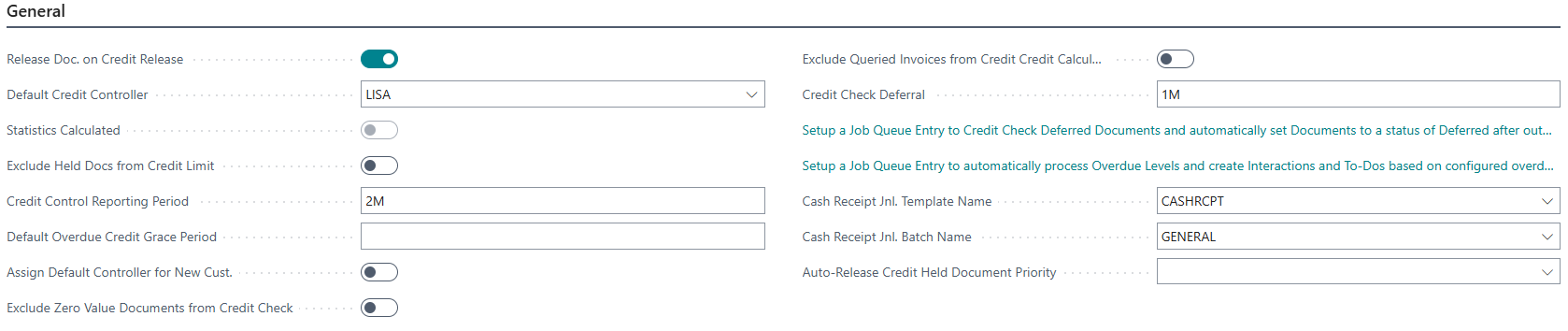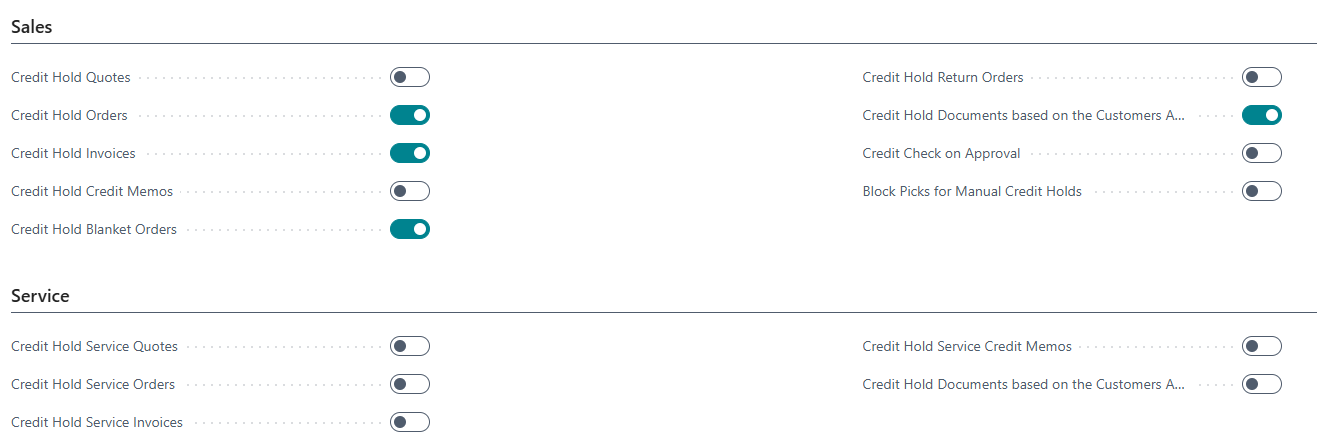 The fields within either the Sales or the Service FastTabs control what documents are credit held (either due to being over their Credit Limit or if there are Overdue payments on the customer account) for both Sales and Services. Selecting any documents within these FastTabs and switching them on will perform a credit check against the relevant customer automatically and put the document on hold, requiring a Credit Controller to release the document, if the customer's credit limit has been reached or they have an overdue balance on their account.