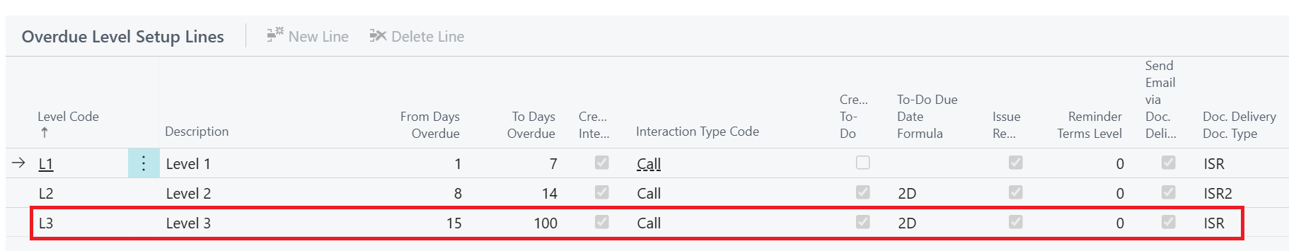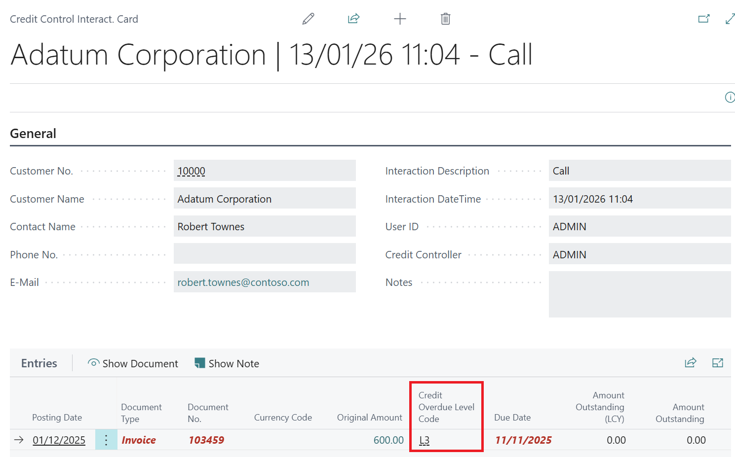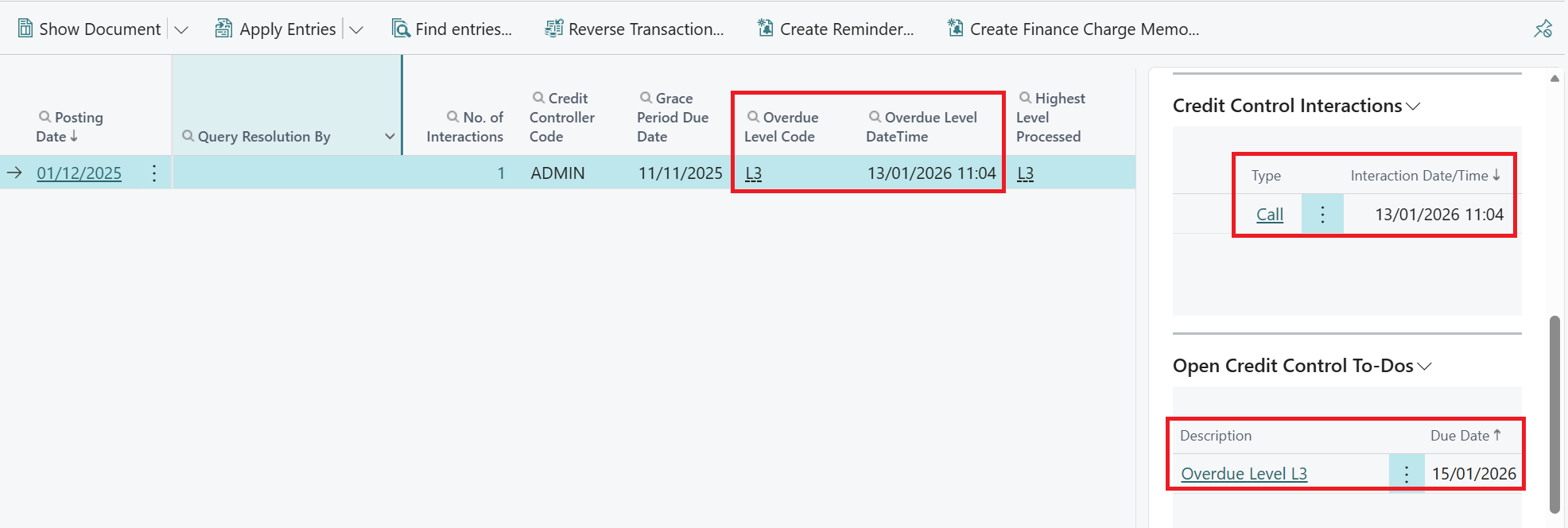 The Credit Interaction and To-Do Card will also display the Credit Overdue Level Code against the entry line.