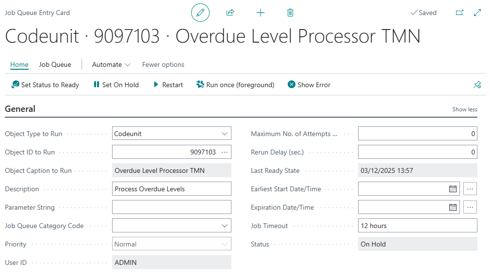 Clicking in here opens up the job queue card which looks like below. Here, you can define the recurrence parameters for how often you want Business Central to check for Overdue entries. Ensure this is set to 'Ready' to start using.