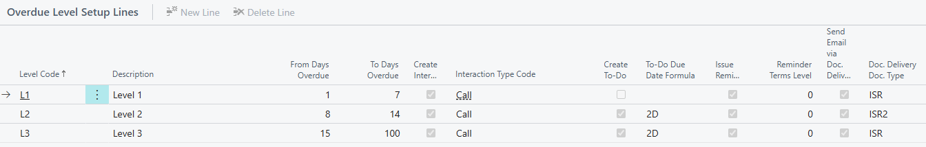 | From / To Days Overdue | From Days Overdue and To Days Overdue, i..e '1' and '7'. This means that Business central will stamp the Level code for any invoices overdue by 1-7 days with this code. |