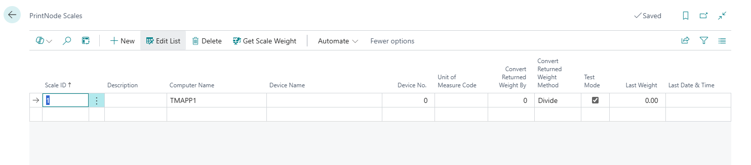 To configure this functionality, use the PrintNode Scales Screen in Business Central or from the "PrintNode Setup" Screen. Here, you can register the details of each connected scale and manage how the system retrieves and processes weight data.