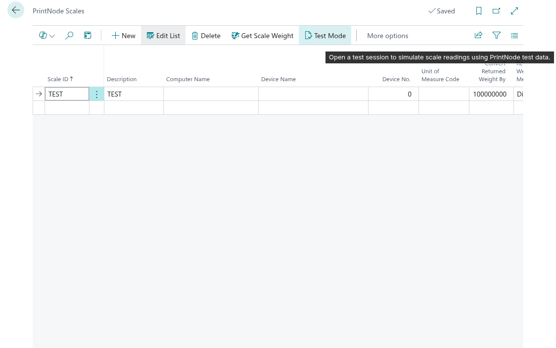 The "Scale Test Mode" screen allows you to verify that your PrintNode scale integration is working correctly by running a 5-minute simulated scale test session. This can be accessed from the "PrintNode Scales" Screen