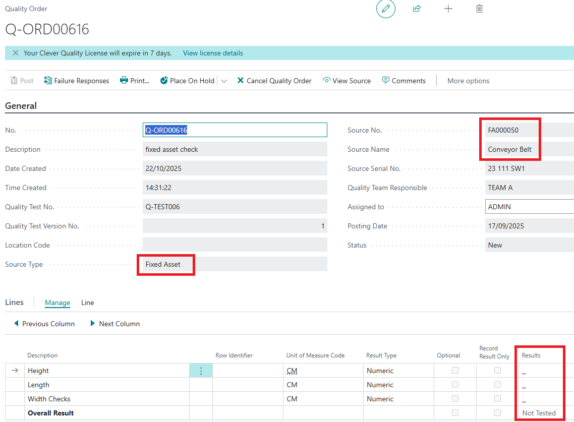 Immediately, a new Quality Order is then created for you, allowing you to perform a check and record results.