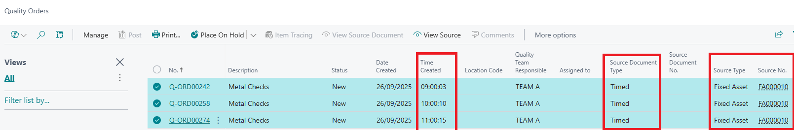 These are now easy to automate utilising the 'Timed (Job Queue)' Transaction Type in "Quality Automation Rules" as well as having Quality Orders available from the below list pages in Business Central.