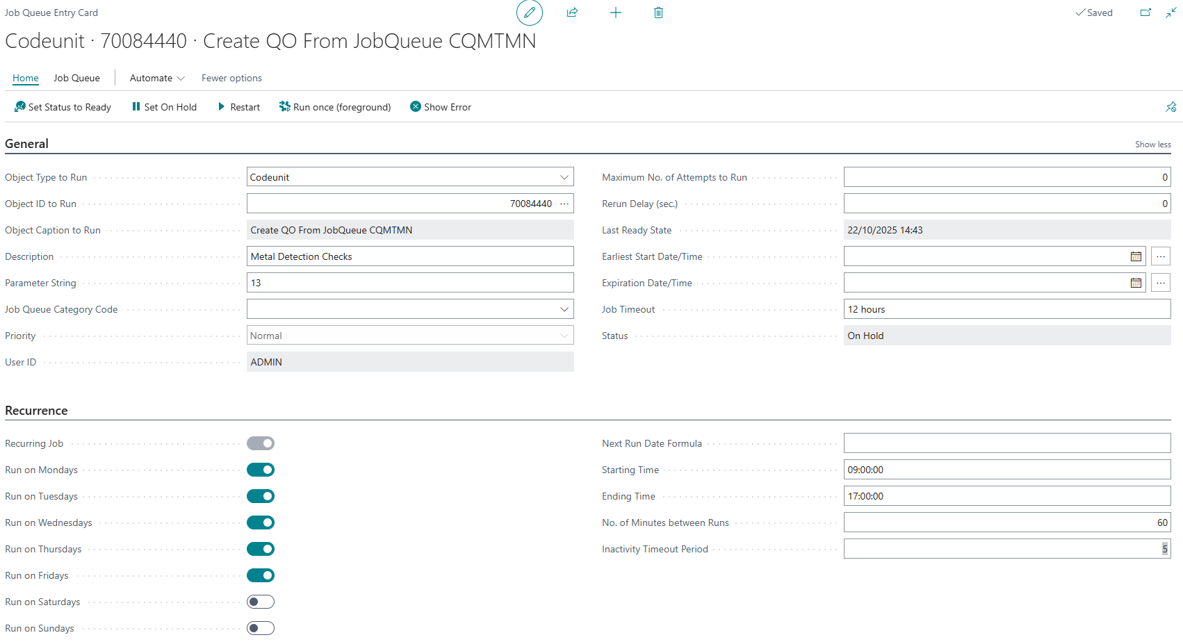 Now you'll need to create the Job Queue Entry which can be done via the option in the ribbon. This will automatically create a job queue like in the example below. All you need to confirm is your Recurrence. So in the example below, Monday - Friday between the hours of 9-5pm, I want an automatic Quality Order raised every 60 minutes against the filters defined in the Automation rule.