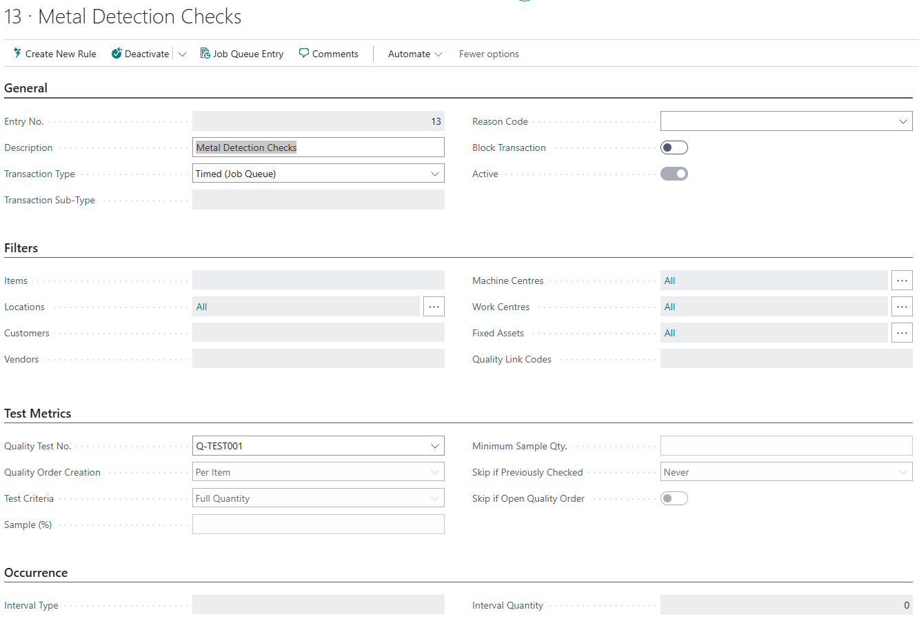 You'll notice that the same options are available to use as filters as mentioned above that can be done manually, so you can be specific about what quality orders are raised. For example, leaving my 4 Filter options as 'ALL' below will raise a Quality Order for EVERY Location, Machine Centre, Work Centre and Fixed Asset in Business Central on a recurring basis (the recurrence defined within the job Queue). So ensure you utilise these filters correctly to limit the number of quality orders raised.