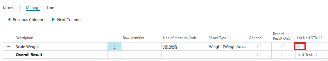 Opening the "Quality Order" card and scrolling down to the Lines FastTab will enable the User to populate and record Test results against the associated "Quality Checks". Simply clicking onto the line shown below in the image will open up the "Quality Result Entry" page.