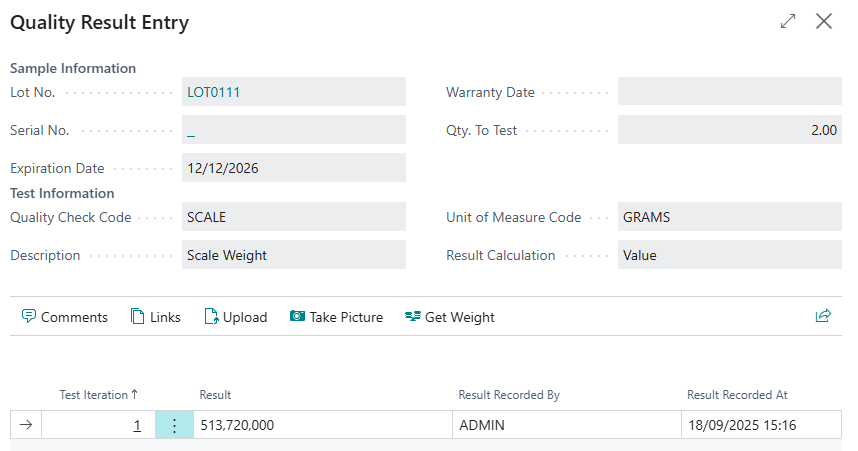 This will automatically populate the Result Recorded By and Result Recorded At fields with the User name and Date/time the result was entered. This process then just needs to be done for all the lines within this "Quality Result Entry" page.