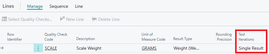 In the example above, the User is instructed to Test '2' however you can see in my lines, there is only room for 1 result. This is due to the setup specified on the "Quality Test", where in this example, I have 'Single Result' as my Test Iteration. Should I have specified 'Sample Size' on the "Quality Test, I would then have 2 lines to enter results, because my Sample Qty is also '2'. Alternatively if you choose 'Fixed No of Results', you can be more specific about how many results you wish to enter when this Check Code and this Test is used on a "Quality Order".