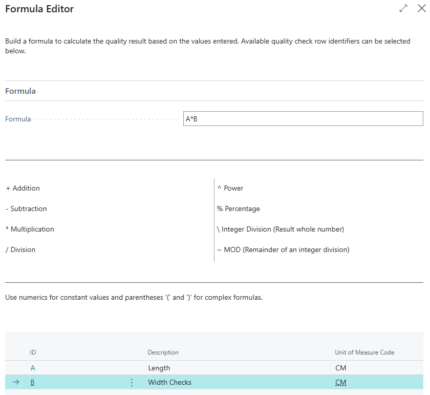 There are some instructions on which symbols to use when creating the formulas, i..e in the above example, I have selected 'A*B', which is Check Code of 'Length' multiplied by Check Code 'Width' to calculate my 'Area'.