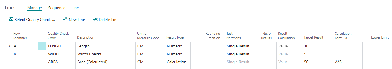 The Quality Check Codes can be populated manually per line, or multiple can be added at one time by using the Select Quality Checks option on the Lines FastTab ribbon which will open up a list of the Quality Check Codes where multiple ones can be selected and confirmed. You can have as many checks here as you wish. Once these are added, many of the other fields will auto-populate, such as the Description, Unit of Measure, Result Type and Rounding Precision which are all pulled from the Quality Check Code Table but are all editable if required. If you want to change the order of the Quality Check Codes, you can use the Sequence option in the Lines ribbon to move the highlighted line up or down.