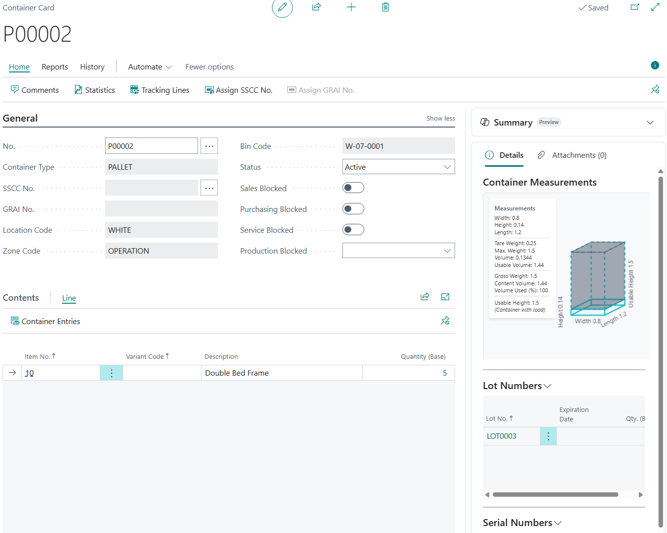 | Purchasing Blocked | When enabled, the container is blocked from purchase-related processes (for example, receiving/put-away against purchase documents, depending on your warehouse processes). |
