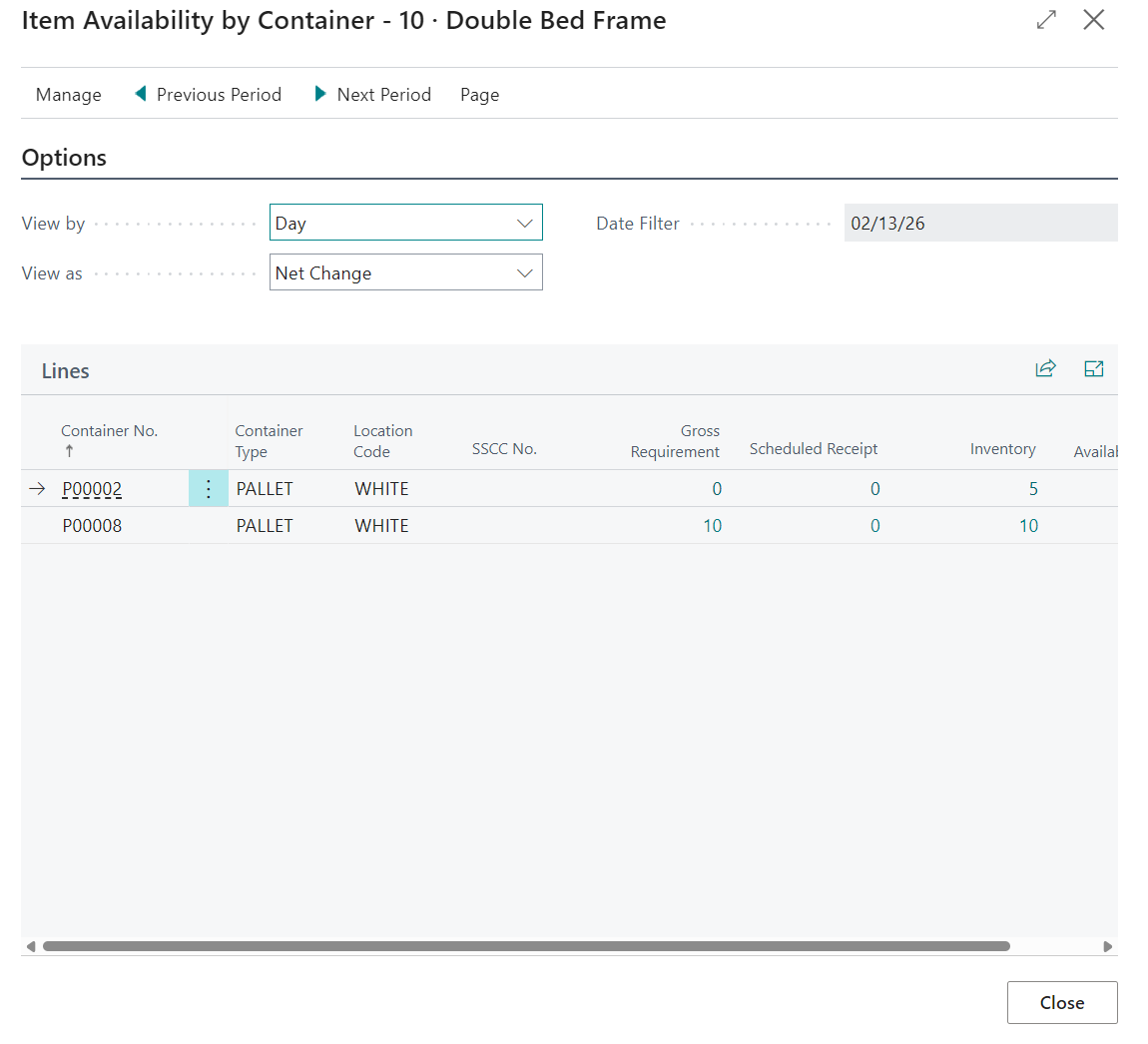 Use the "Item Availability by Container" screen to analyse projected and actual availability by container across time periods.