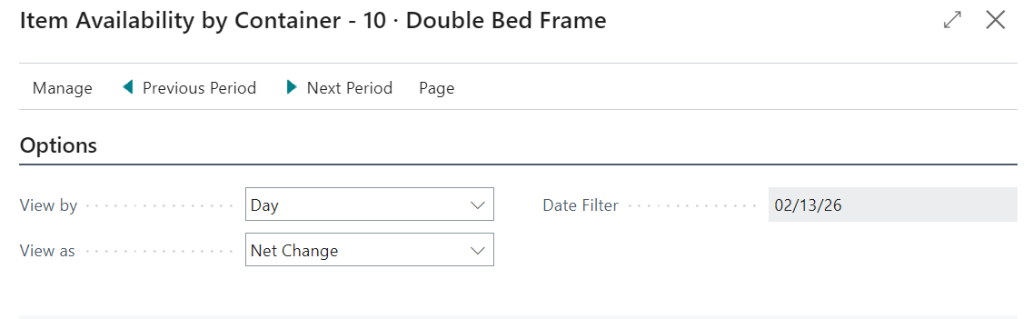 Open the "Item Availability by Container" screen and set View by, View as, and Date Filter.