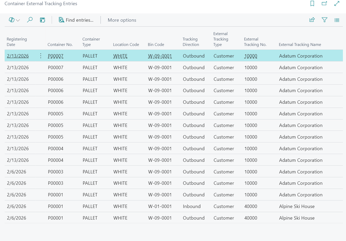 Review key fields such as Posting Date, Container No., Container Type, Location Code, Bin Code, Tracking Direction, External Tracking Type, External Tracking No., External Tracking Name, Source Document, Source No., and Document No..