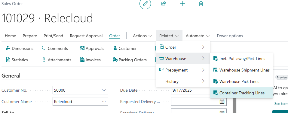 "Container Tracking Lines" can be accessed from the "Sales Order" screen if required and can be viewed by selecting Related > Warehouse > Container Tracking Lines.