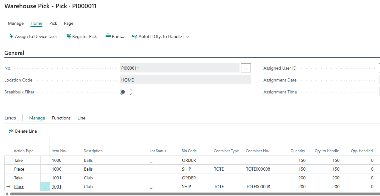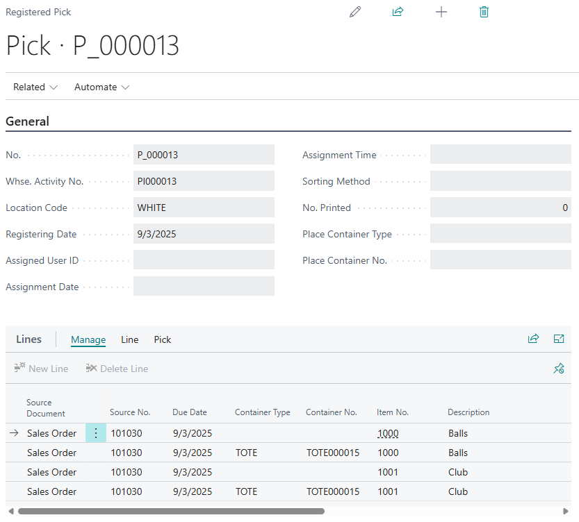 In addition, the Container details will also be recorded against the "Registered Pick" and the related "Warehouse Entries" that are created.