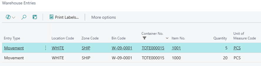 Once the "Warehouse Pick" is registered the "Container Card" will be automatically updated to reflect which items are now stored within it as well as the Location Code, Zone Code and Bin Code information as required. "Container Entries" will also be created ensuring a full trace of movements into and out of a Container.