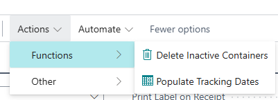 Opens the Functions sub menu for Delete Inactive Containers and Populate Tracking Dates.