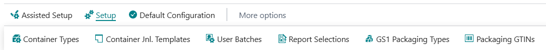Opens the sub menu for Container Types, Container Jnl. Templates, User Batches, Report Selections, GS1 Packaging Types and Packaging GTINs