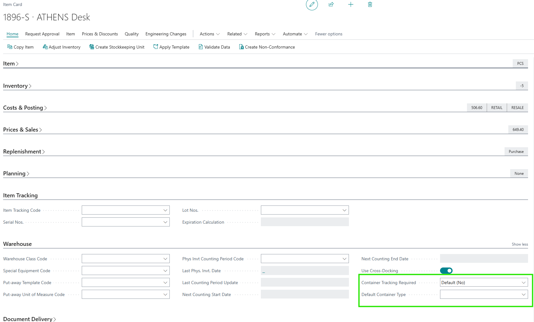 This field is used to determine whether the Container Tracking functionality needs to be used when processing Warehouse Documents for the item. You will need to select one of the following options: Default – If you select this option, then the Container Tracking Required option will be taken from the Item Category Code assigned against the item. Yes – If you select this option, then the item will require Container Tracking to be defined when processing Warehouse Documents for that item. No – If you select this option, then the item will not require any Container Tracking to be defined when processing Warehouse Documents for that item. |