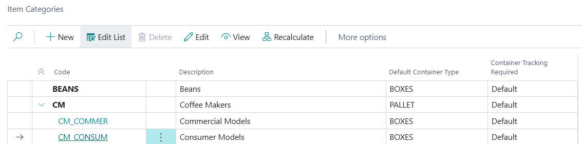This field is used to determine whether the Container Tracking functionality needs to be used when processing Warehouse Documents for items which have the item category assigned to them. You will need to select one of the following options: Default – If you select this option, then the Container Tracking Required option will be taken from a Parent Item Category Code assigned against the selected Item Category Code for the item. It will look through the parent entries and try or find either a Yes or No value and then use that option for the Container Tracking. If it cannot find either against a Parent, then No will be used. Yes – If you select this option, then Container Tracking will need to be defined when processing Warehouse Documents. No – If you select this option, then Container Tracking will need to be defined when processing Warehouse Documents. |