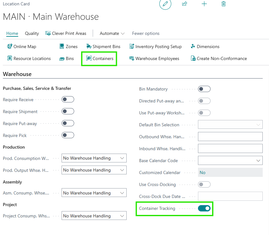 This field will need to be enabled if you would like to use the Container Tracking functionality when processing Warehouse Documents for that location. |