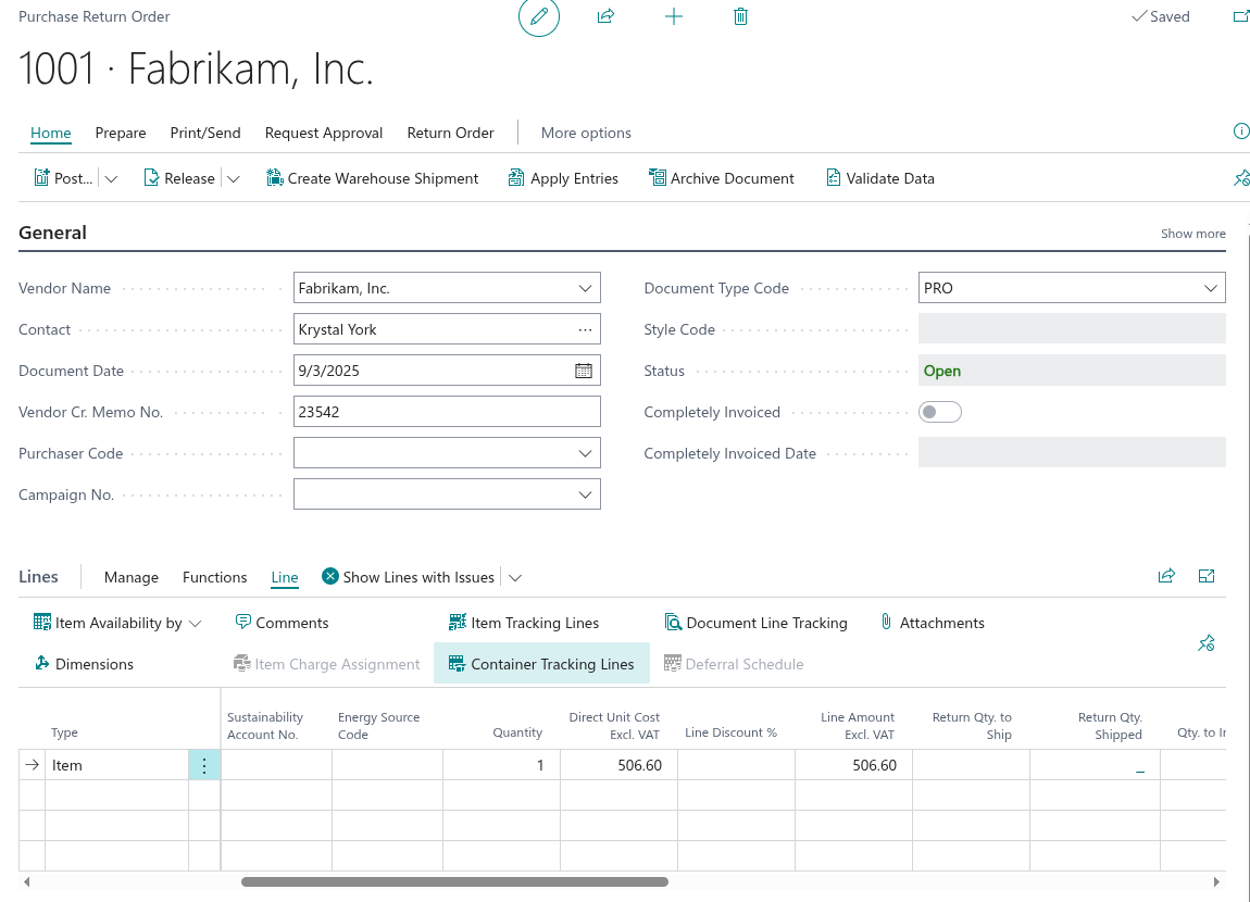 - From the “Purchase Return Order” screen, select Container Tracking Lines to review or maintain tracking for the document.