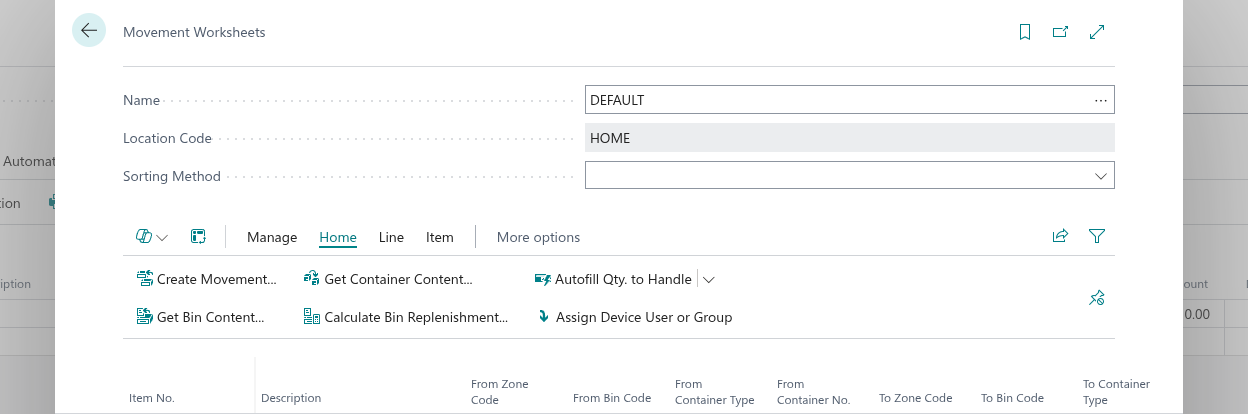 - Use the "Movement" worksheet to move items between containers and bins in warehouse-managed locations.