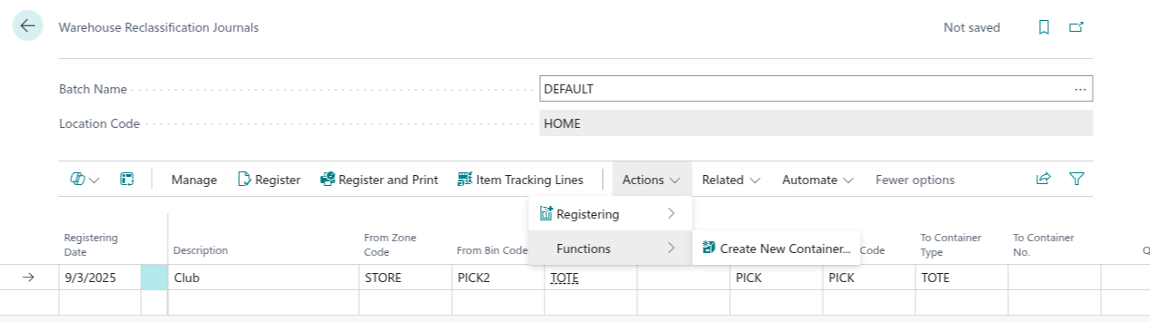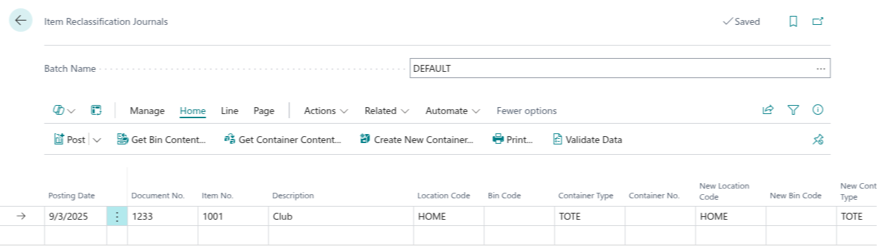 - Item Reclass. Journal: Enter the source From Container No. and the destination New Container No. on the journal line.