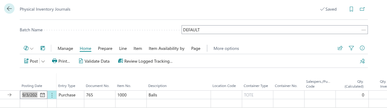 - Create a physical inventory line with the container No. and a quantity of zero.