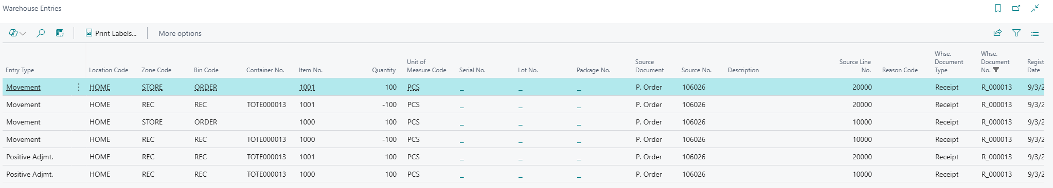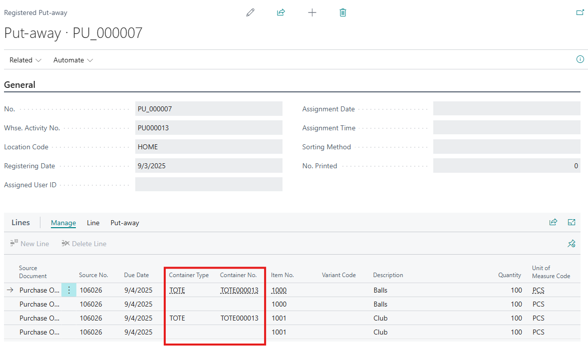 In addition, the Container details will also be recorded against the Registered Put-Away Lines and the related Warehouse Entries that are created.