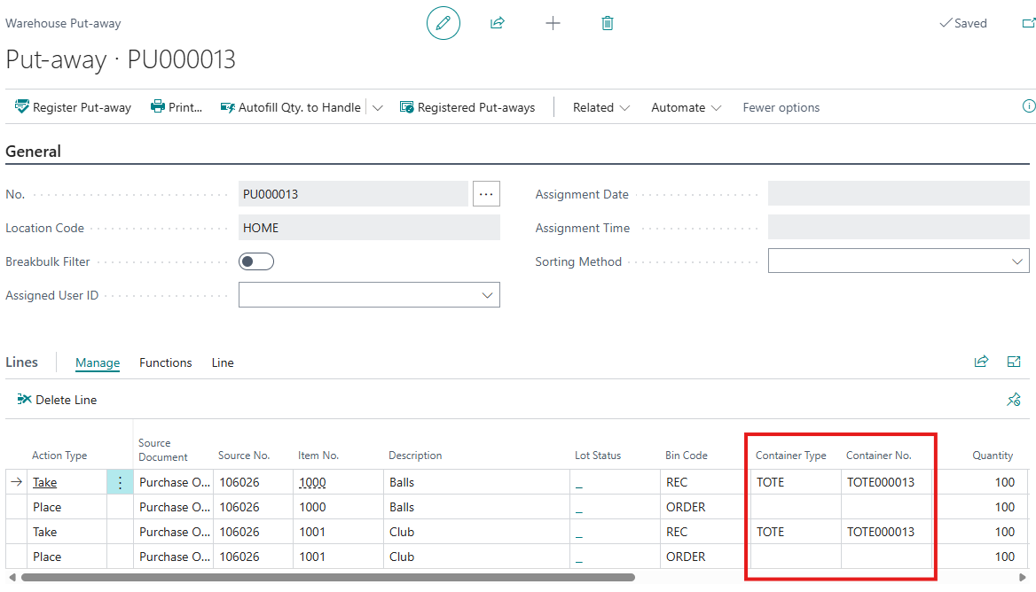 Note: if the Container detail has been populated on the Warehouse Receipt, then the Container can be changed on the Place line if required but should not be changed on the Take line. This is because the Warehouse Put-Away document must take them out of the Container/Bin they were placed in when they were received in in order to ensure the warehouse data is correct.