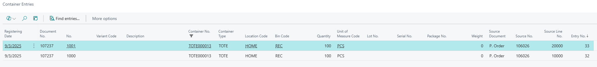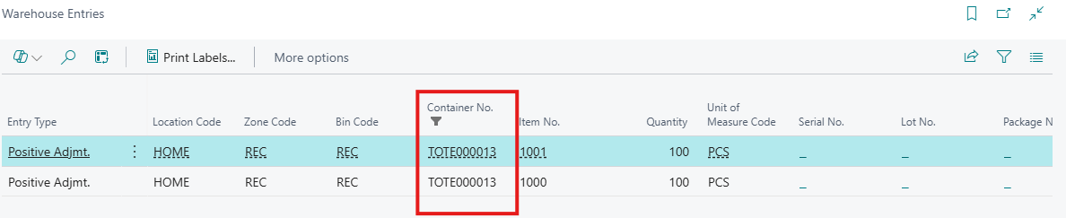 In addition, the Container details will also be recorded against the Posted Warehouse Receipt Lines and the related Warehouse Entries that are created.