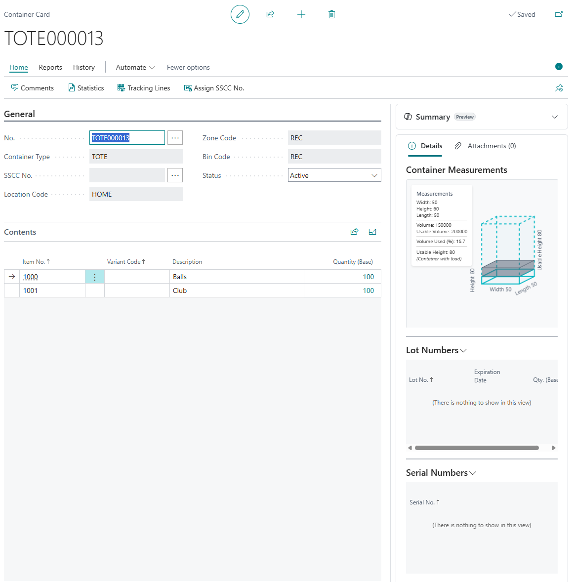 Once the Warehouse Receipt is posted, the Container Card will be automatically updated to reflect which items are now stored within it as well as the Location and Bin information. In the Details pane you will also see the Container Measurements have been updated, and a visual representation of the container will show how full the container is. Below this you will see Lot and Serial number information registered against the items should these be populated.