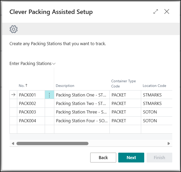 The next Page provides you with the ability to be able to create the required Packing Stations. This information will then be recorded on the Packing Stations Page.