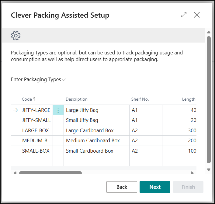 The next Page allows you to be able to define any Packaging Types you might want to use. This information will be recorded on the Packaging Types Page.