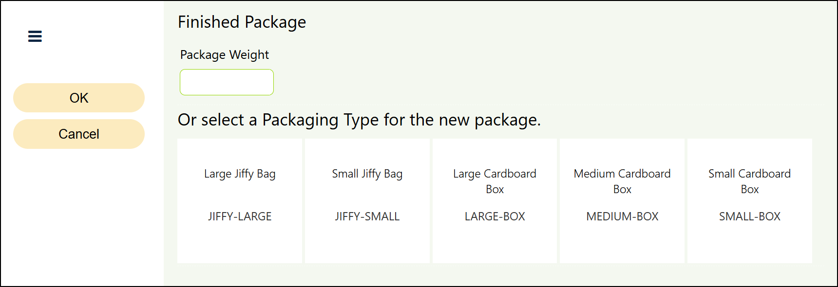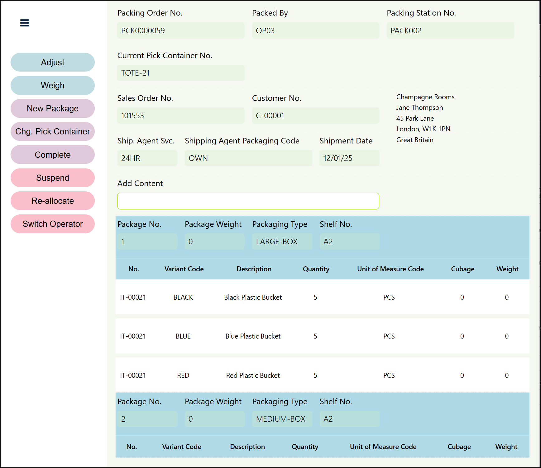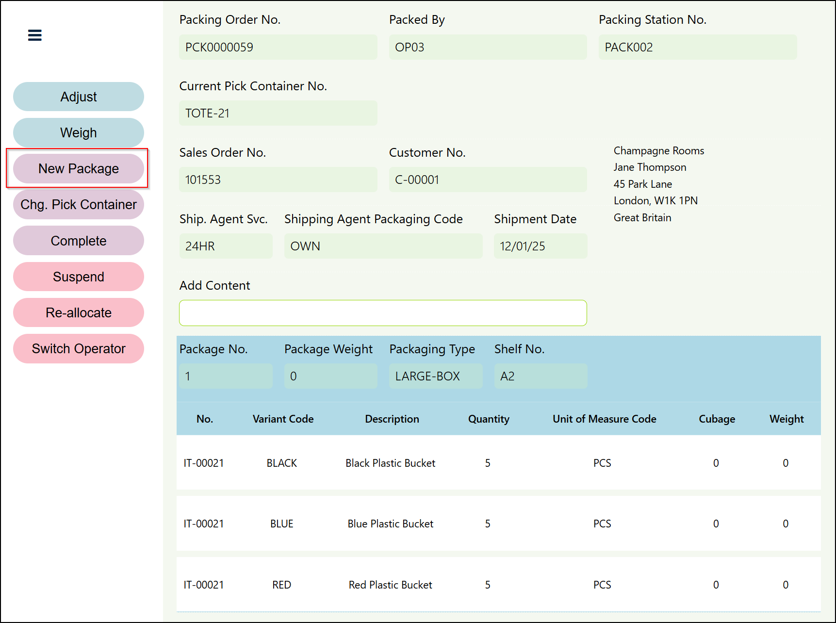 If a Packing Operator needs to add more packages to the Packing Order, this can be done by selecting the New Package button.