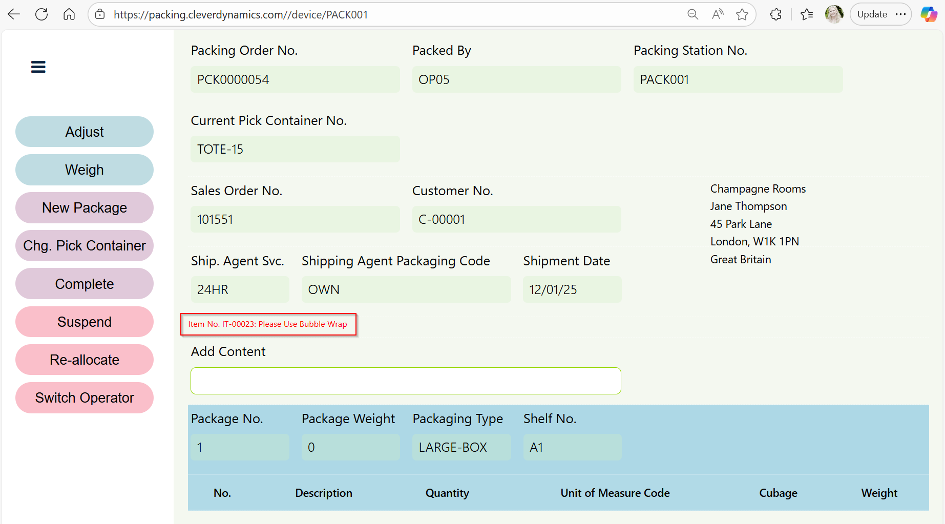 The Packing Operator should then either scan the barcode or enter the item number for one of the picked items within the container into the Add Content field. The items will then be added into the package that is currently selected. The next item number should then be scanned or entered until all the items within the container have been added.