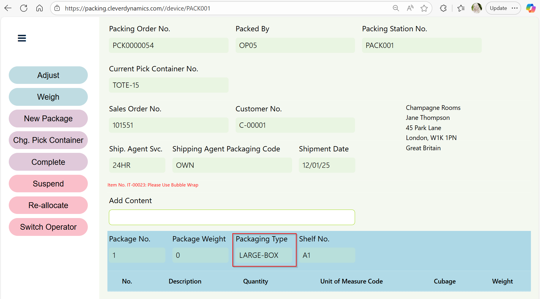 The suggested packaging can then be changed if required by simply clicking on the Packaging Type Field and selecting a different one, or additional packages added as described here.