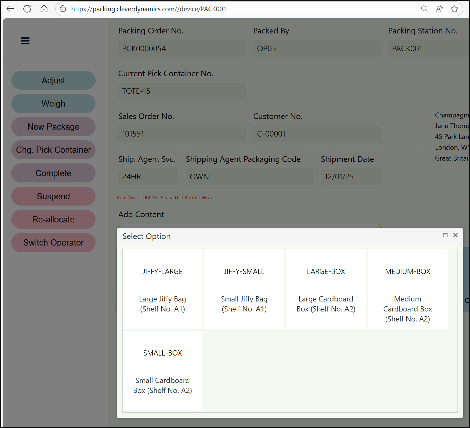 Based on the items that have been picked into the container, the most relevant Packaging Type will then calculated and suggested.