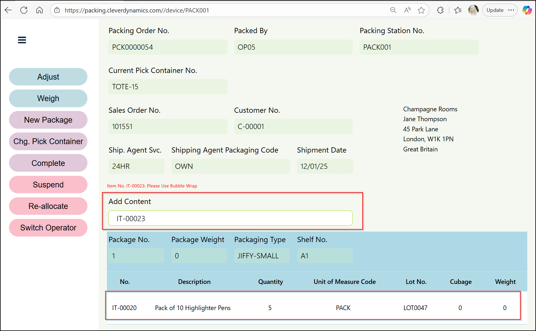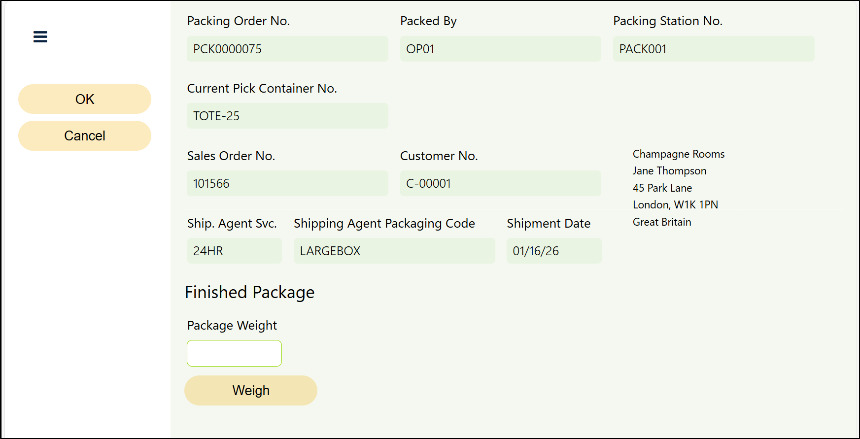 To finish the Packing Order, click on the Complete button from the buttons available on the left hand side of the Page. On this Page, you will be able to weigh the package by populating the Package Weight Field.
