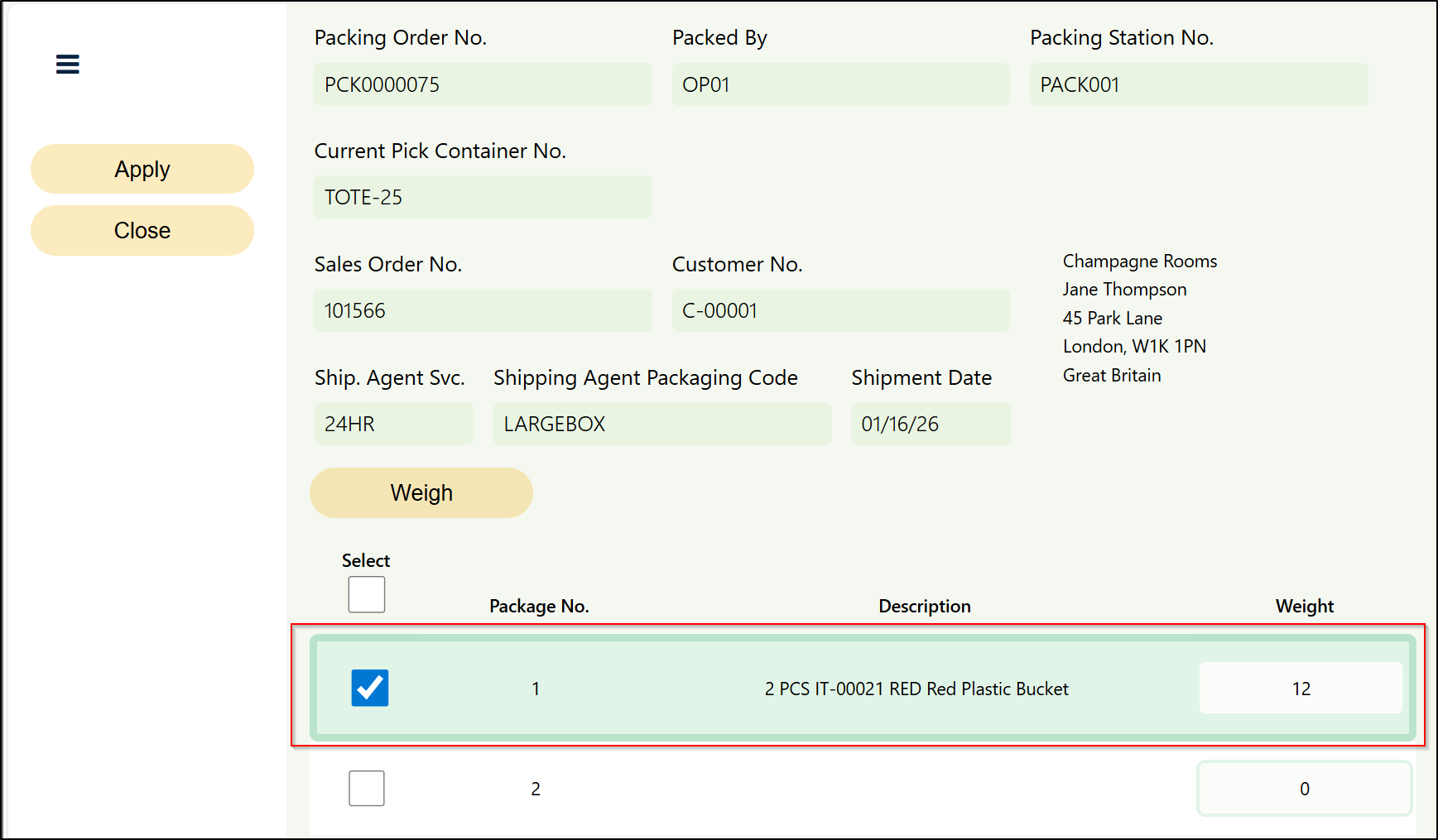 Once weighed, click the Apply button and then the Close button to return to the main Packing Portal page. The weight information populated will be recorded in the Package Weight Field.
