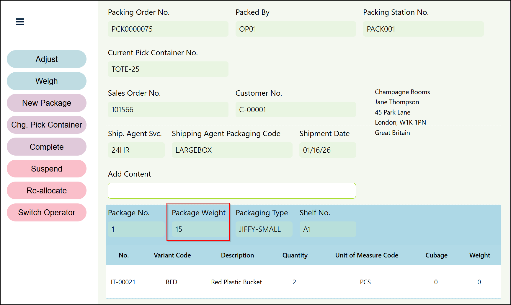 As described in the Creating and Processing a Packing Order section, if you only have one Package on a Packing Order, then you can weigh the Package at the point you complete the Packing Order.