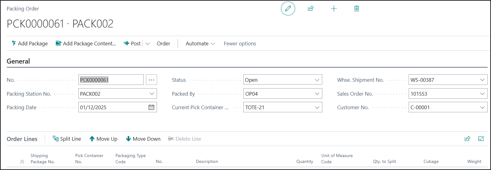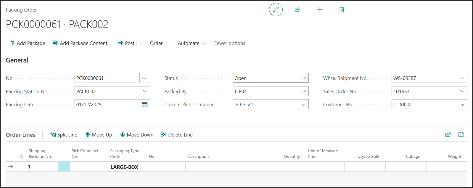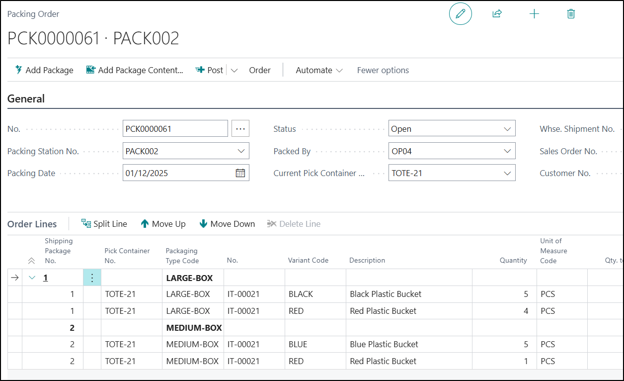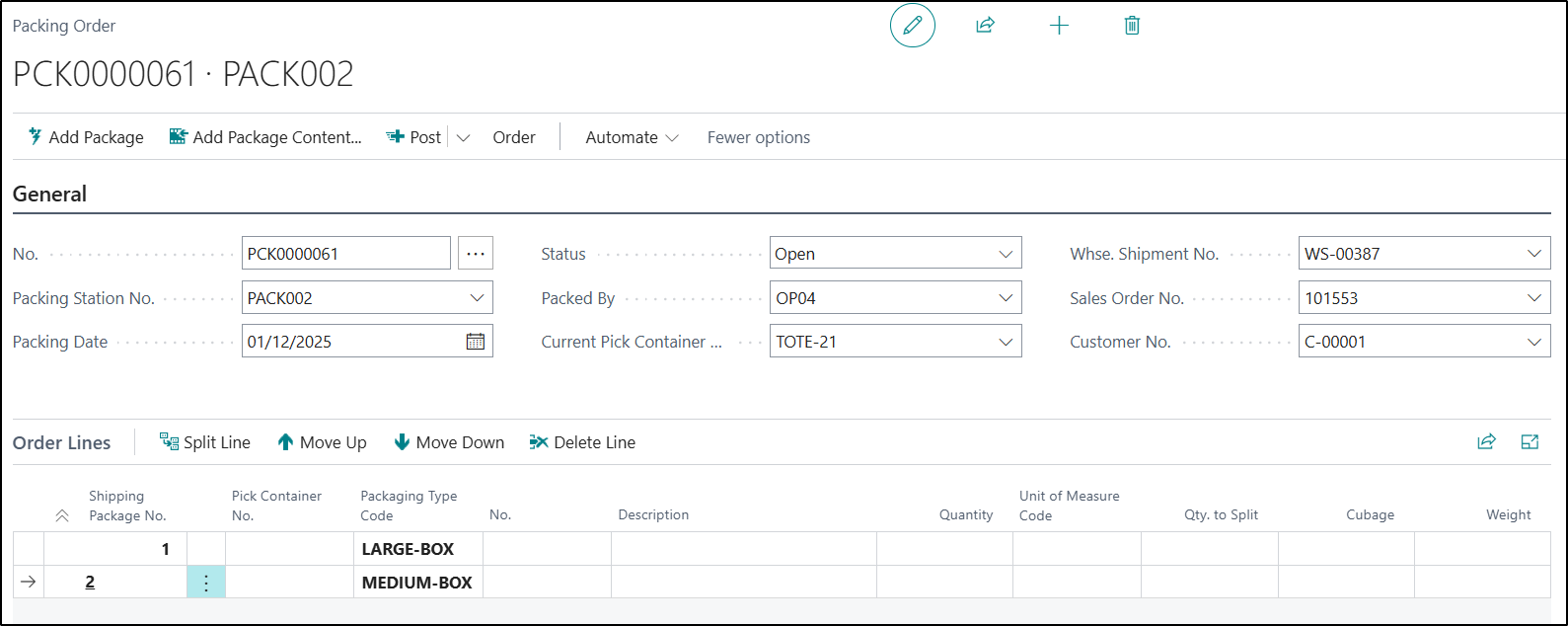 Once all the required items have been added to the Order Lines FastTab and lines split, if required, the Packing Operator can use the Move Up and Move Down buttons to move the lines into the correct packages.