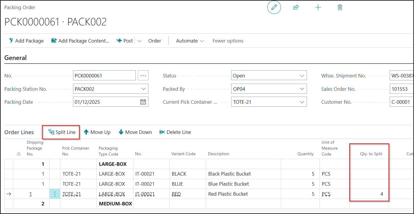 If the user needs to move a partial quantity of an item into another Package, this can be done by populating the Qty to Split field with the quantity that needs to be moved and then selecting the Split Line button on the ribbon.