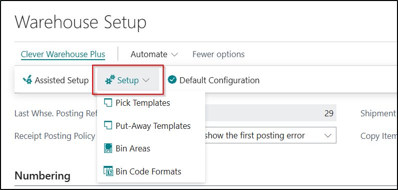 All the setup Pages which are part of Clever Warehouse Plus have been added underneath the Setup option on the Ribbon:
