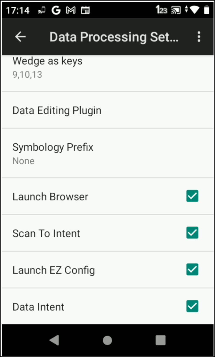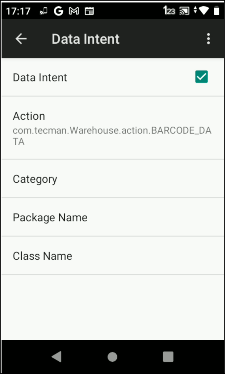 Click on the Data Intent option and set the Action value to com.tecman.Warehouse.action.BARCODE_DATA.