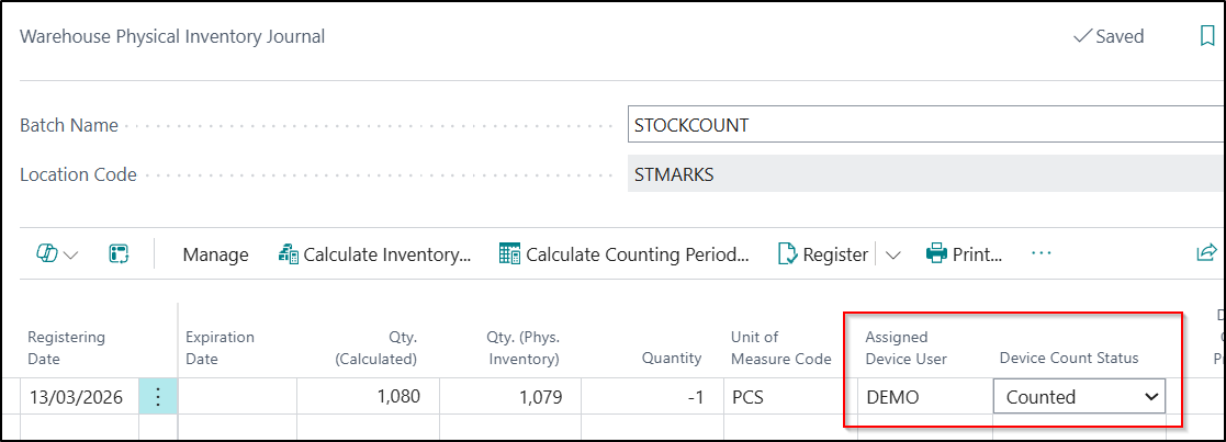 If there is a difference between the Quantity entered on the Device and the Quantity that Business Central thinks is available, then either a Warehouse Physical Inventory Journal or a Physical Inventory Journal entry will be automatically created. The line will be marked as Counted and the Device User who completed the count will be recorded against the journal line.