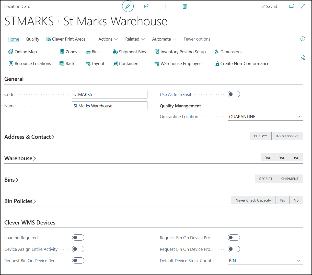 For Clever WMS Devices to be used correctly and for Locations to be visible on a Handheld Device, a Location must be set up to use Bins and have Bin Mandatory Field Enabled.